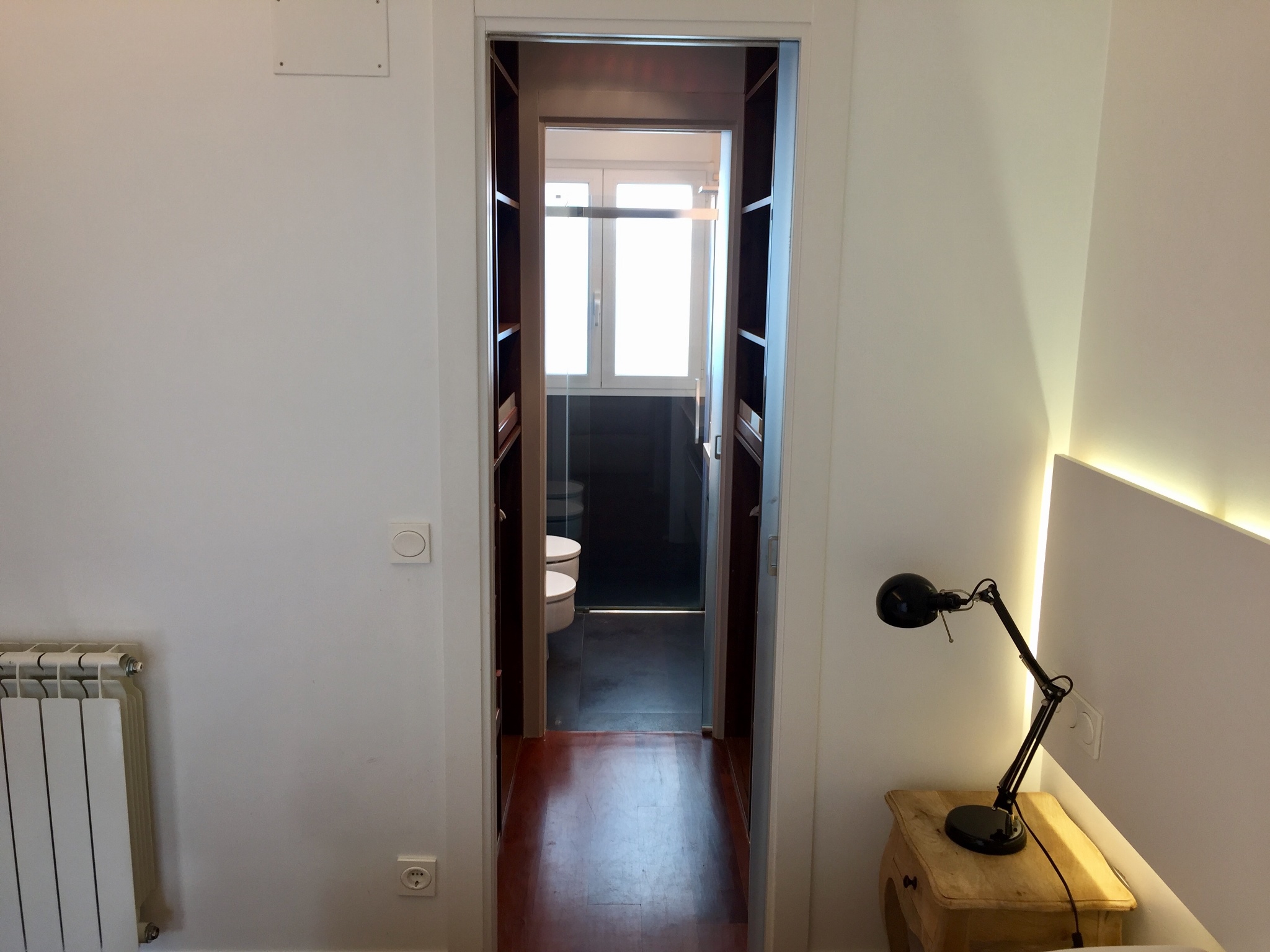 - Habitación principal exterior con balcón con cama de matrimonio, vestidor y baño incorporado con ducha.